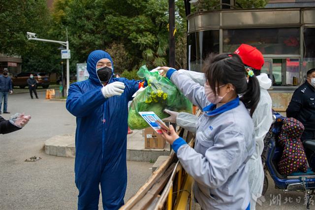 为遏制疫情扩散蔓延,2月17日至19日,武汉市开展为期3天的拉网式大排查。连日来,社区工作者、下沉党员干部、志愿者共同行动,对辖区内小区居民逐家逐户排查,全面清查“四类人员”,同时在各小区门口设立检查点,实行24小时封闭管理,禁止外来车辆入内,小区内人员凭通行证出入,并进行登记、检测体温。图为2月19日,武汉市洪山区白马洲社区,武汉地铁集团下沉员工易俊为居民送菜。(湖北日报全媒记者蔡俊 通讯员 王遥遥 袁永华 摄)