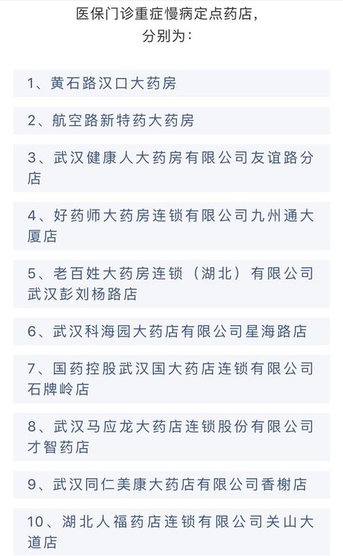 据介绍,目前武汉市办理了门诊治疗重症(慢性)疾病的参保患者实行定点就医管理,由参保人选定一家有门诊重症(慢性)疾病治疗资格的医院为定点医院就医,同时可选定一家门诊重症慢病定点药店购药。