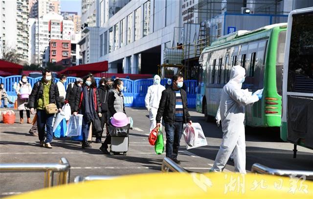 20日下午,出院者有序走出江汉方舱医院。(湖北日报全媒记者 龙华 通讯员 刘坤维 摄)