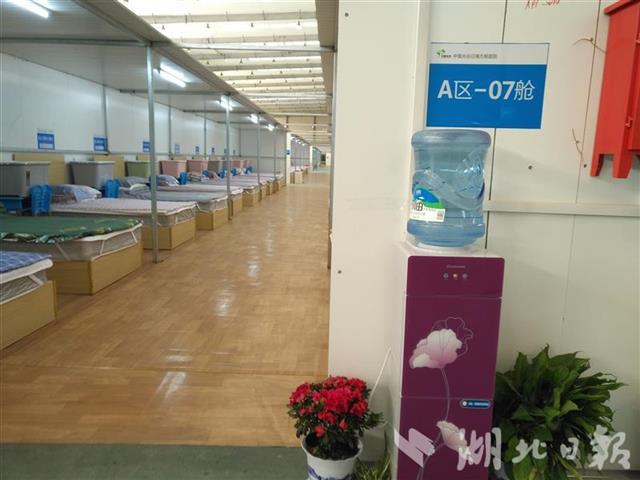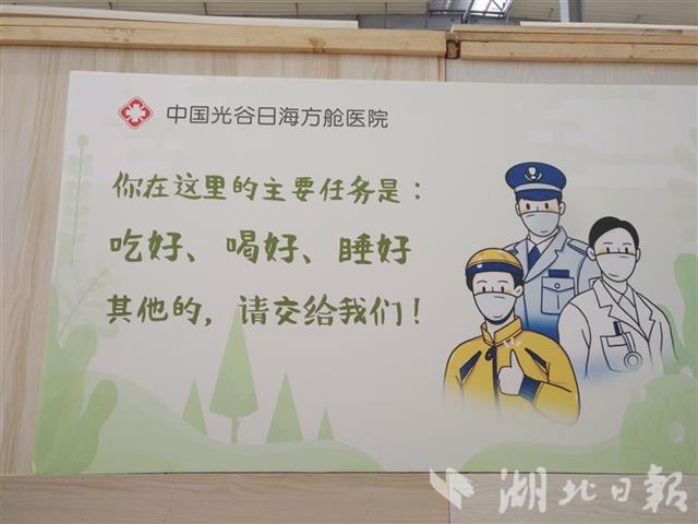 日海方舱医院内,随处可见绿色盆栽植物、红色中国结以及鼓舞人心的宣传语等。比如,有墙上张贴的“医院寄语”写有“这座医院将很快关闭,因为您将康复回家”“你在这里的主要任务是:吃好、喝好、睡好。其他的,请交给我们”“春暖花开,我们一起去武大看樱花”“不要皱眉,微笑和开心有助于提升免疫力,病毒最怕她们”等,温暖亲切,鼓舞人心。