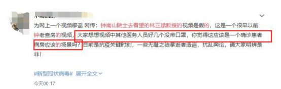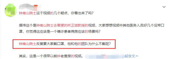 对此,记者向钟南山院士团队核实,这是钟院士以前的查房视频,与本次疫情无关。视频中的患者也不是林正斌教授。