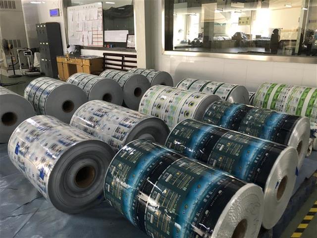 另一头是近三层楼高的聚乙烯“吹膜机”,白色的聚乙烯颗粒被高温加热后,变成一卷卷塑料保鲜“内膜”,再被送至中央的“复合”车间与外包装膜黏合。一卷卷复合薄膜食盐包袋经40℃电烘房“熟化”工艺后,便可切割装箱打包,运至盐厂装上食盐后投入市场。