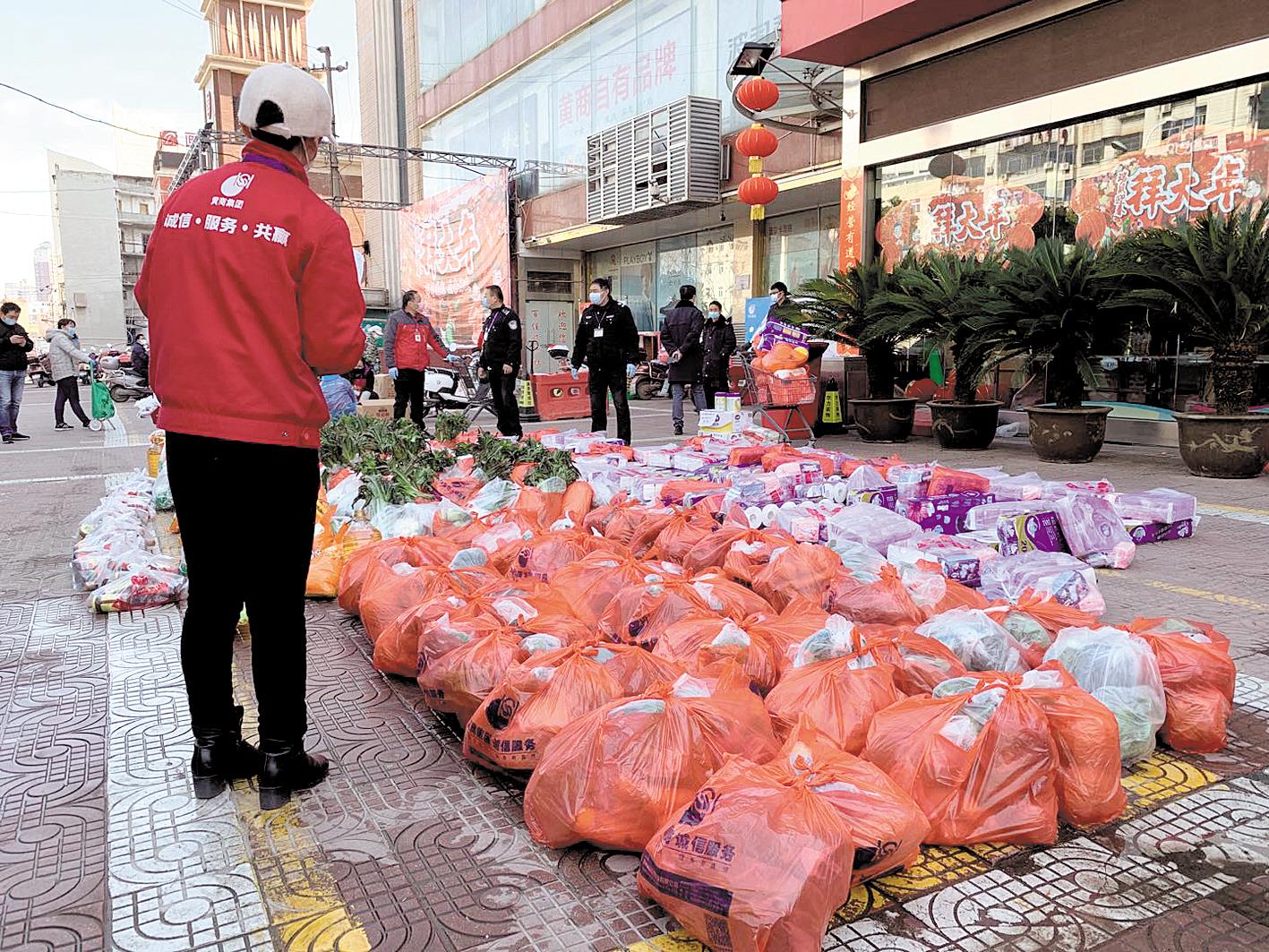 2月15日起,黄冈所有小区全封闭管理,居民只能通过社区代购员购买生活用品。黄商集团承担市区近70%居民的生活物资配送。