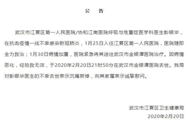 2月20日晚,武汉市江夏区卫生健康局发布公告:武汉市江夏区第一人民医院/协和江南医院呼吸与危重症医学科医生彭银华,在抗击疫情一线不幸感染新冠肺炎,因病情恶化,经抢救无效,于2月20日21时50分在武汉市金银潭医院去世。