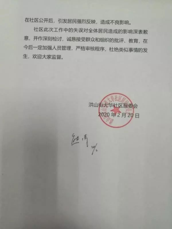 在20日晚,洪山街道办和大华社区居委会,对这一情况进行了紧急处理,并对外发布了情况说明,在说明中深刻检讨,真诚致歉。