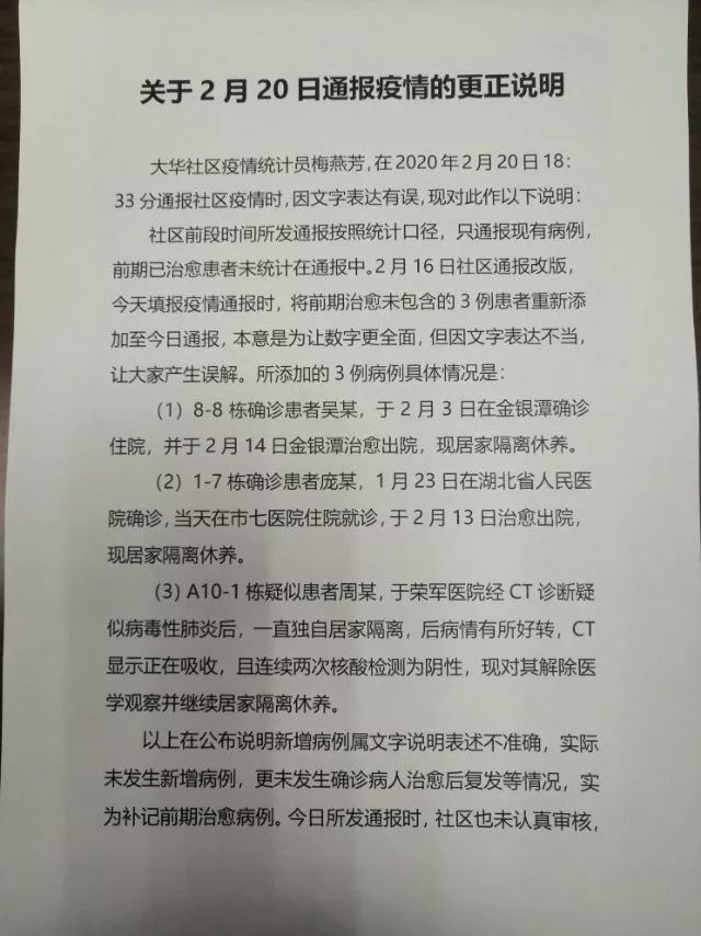 随后,大华社区业主也传出一份《关于洪山街大华社区2月20日疫情通报的情况说明》,称并不存在社区患者治愈后复发,而是相关工作人员在统计数据时表述不当。