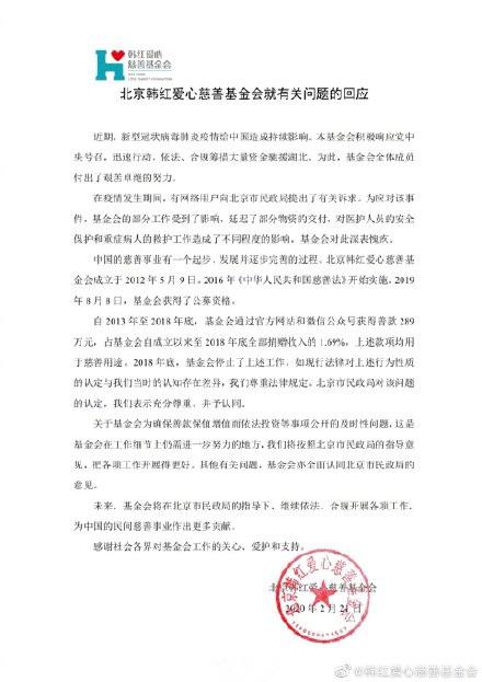 网易娱乐2月21日报道 北京韩红爱心慈善基金会就有关问题的回应