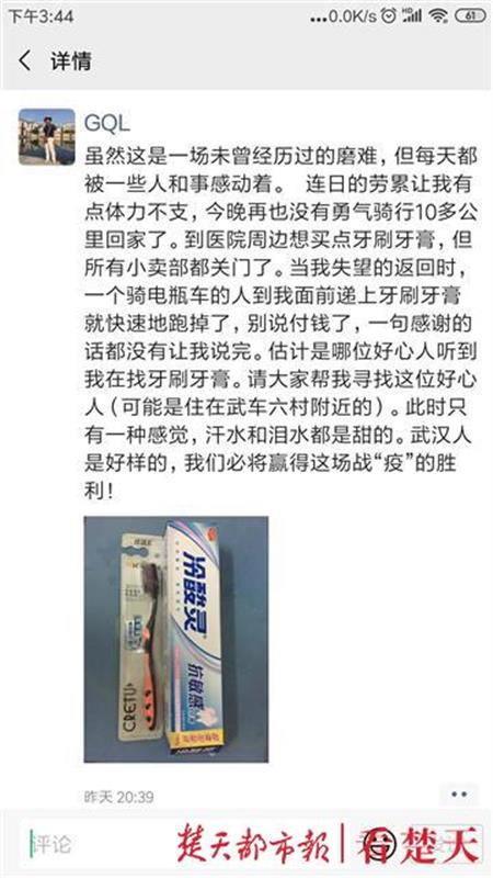 “当时我只有一种感觉,汗水和泪水都是甜的。武汉人是好样的,我们必将赢得这场抗疫的胜利!”发完朋友圈,郭庆连在办公室翻箱倒柜,终于找到替代品。这是某次出差后,他从酒店带回来的一次性牙膏和牙刷。