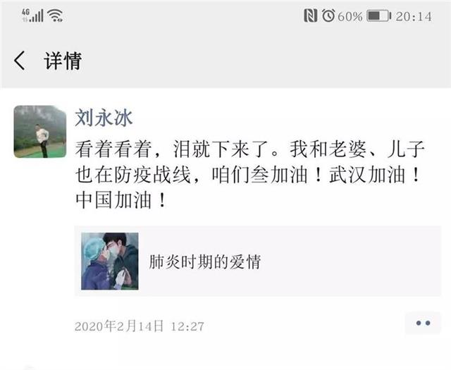 虽然一家人不能见面,刘永冰却时常在朋友圈隔空喊话,为自己和妻子、儿子打气:“咱们仨加油!武汉加油!中国加油!”