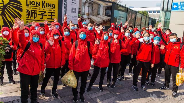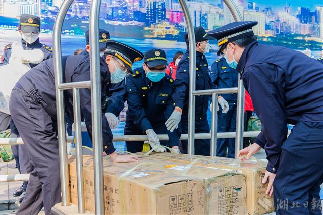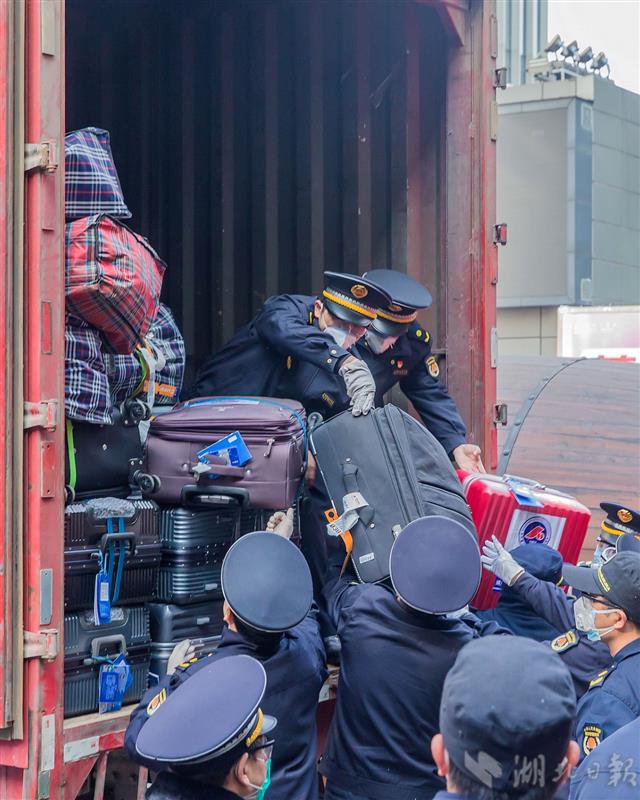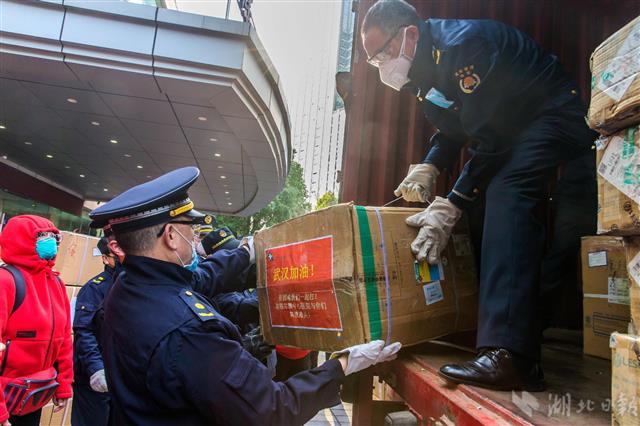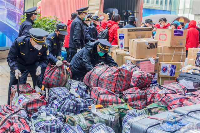 2月21日,武昌区城管执法大队组织突击队员60余人,帮助刚刚抵达武汉的内蒙古第七批援汉医疗队搬运行李和医用物资。