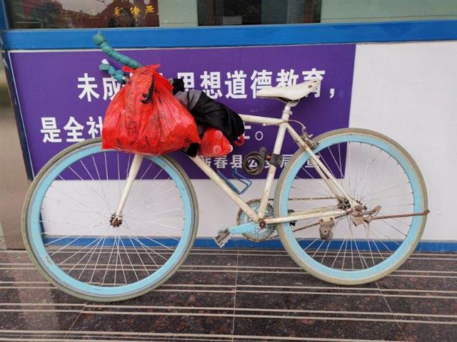2月18日晚上,孙文到达了蕲春县境内,但由于自行车不堪重负,四根钢丝已断裂,钢圈已变形,无法再骑了。提起当时的情形,孙文感慨不已:“那里的工作人员十分友好,给我提供了一辆旧的山地车,还给了份盒饭。”