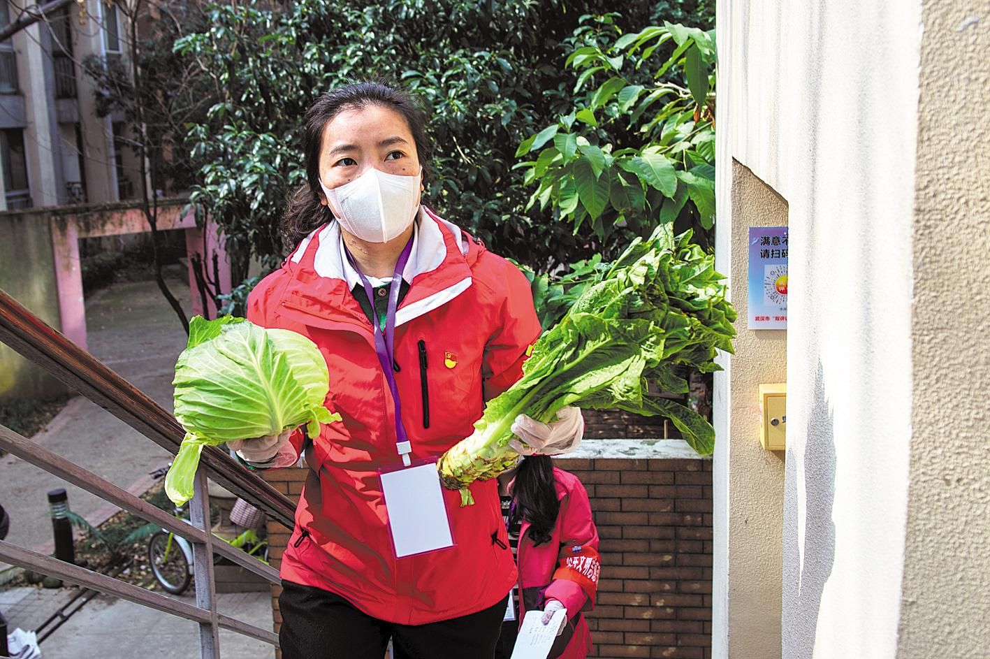 2月22日,武昌区水岸星城社区,彭婧为行动不便的居民送菜。 (湖北日报全媒记者 蔡俊 摄)
