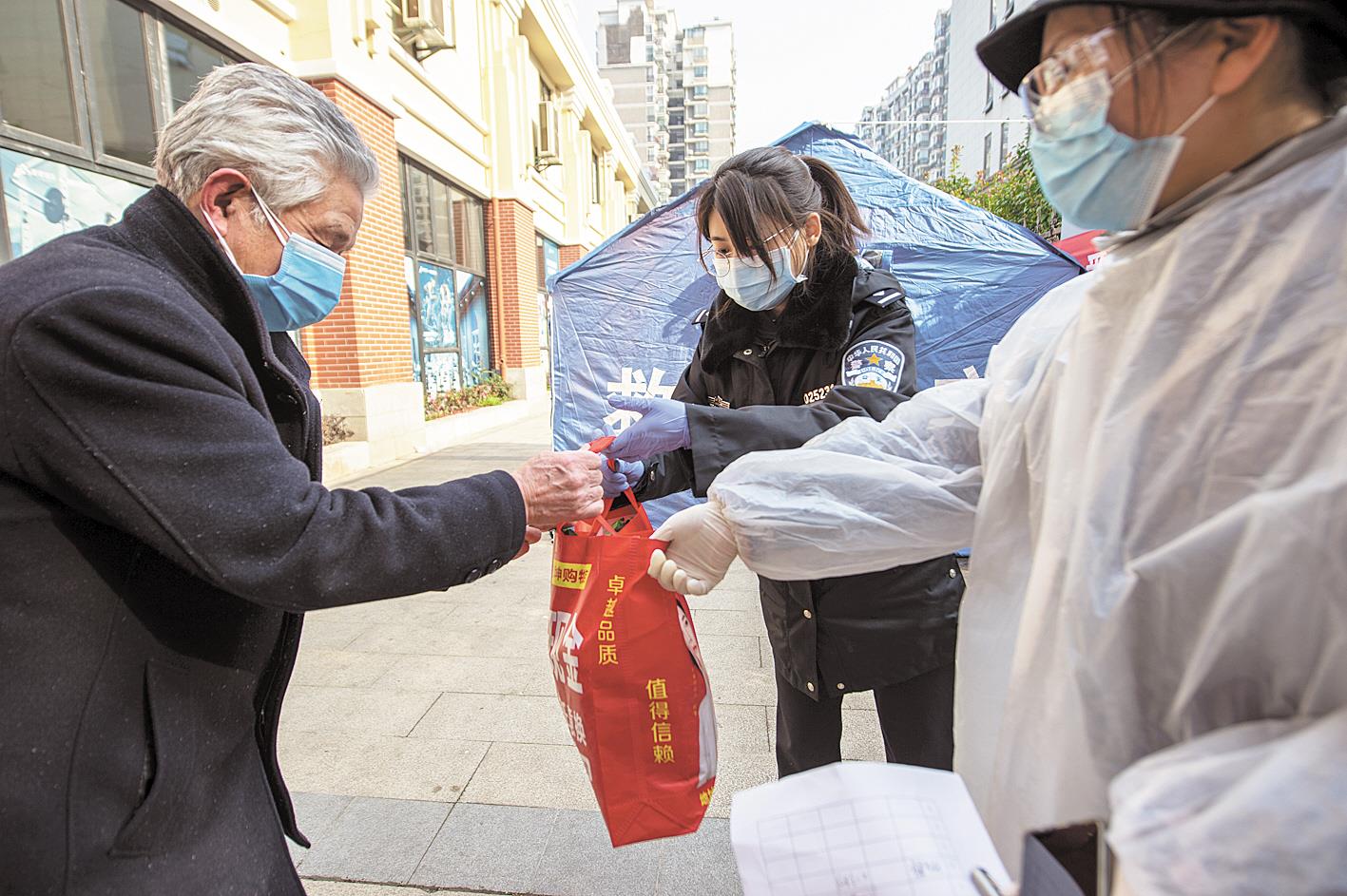 2月21日,武汉市江岸区韦桑社区,社区民警郑燕为居民送去生活物资。26岁的郑燕是武汉市公安局江岸区分局二七街派出所的一名社区民警。新冠肺炎疫情发生以来,郑燕一直坚守在韦桑社区一线,每天同社区工作者排查“四类人员”,宣传防疫知识,同时为孤寡老人及行动不便的居民送菜送药。