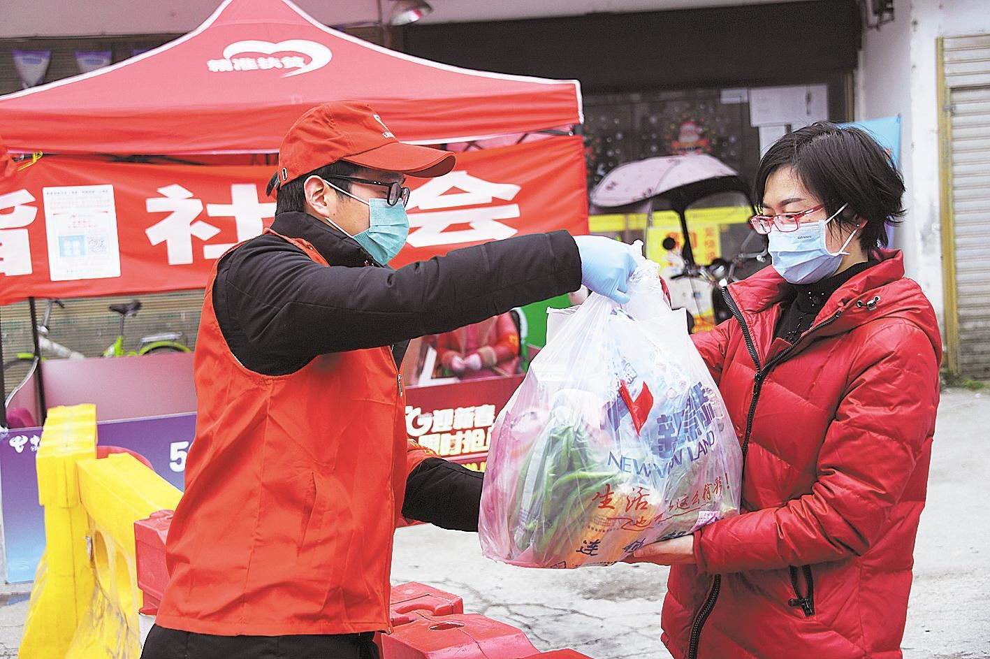 2月22日,宣恩县珠山镇大学生村官赵植(左)将采购的生活物资送到村民手中。今年25岁的赵植是珠山镇的一名大学生村官,自新冠肺炎疫情防控工作启动以来,他主动请缨到县城出入口交通管制点工作,为出入县城的车辆和人员测量体温,还义务为村民采购生活物资。他说:“作为一名青年党员,让青春在战疫一线绽放,我觉得很值得。”