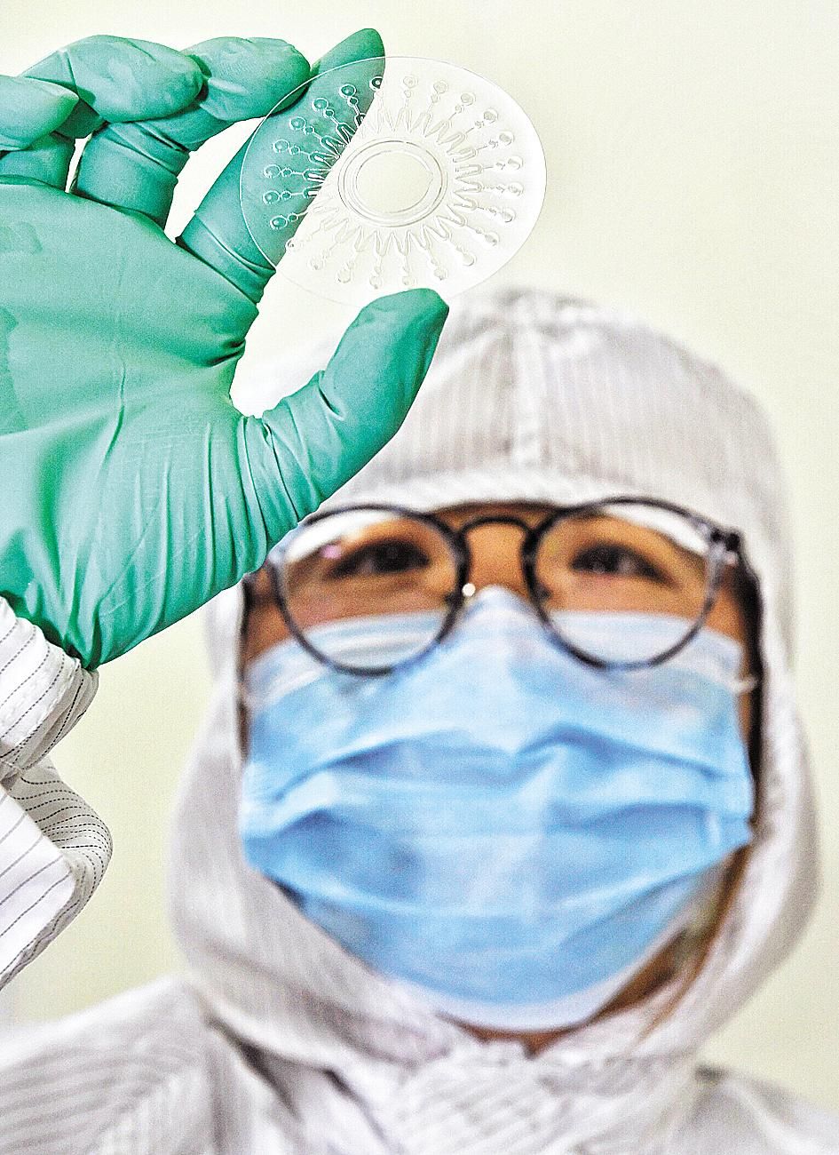 近日,由成都博奥晶芯生物科技有限公司联合清华大学、四川大学华西医院共同设计开发的“呼吸道病毒(6种)核酸检测试剂盒(恒温扩增芯片法)”,只需采集患者的鼻、咽拭子等分泌物样本,在1.5小时内便可一次性检测包括新冠肺炎病毒在内的6种呼吸道病毒。图为该公司员工在展示恒温扩增芯片。(新华社发)
