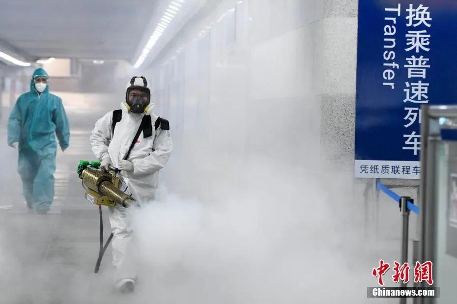 图为志愿者在对人行通道进行消毒。杨华峰 摄