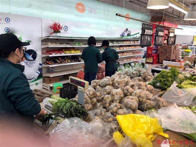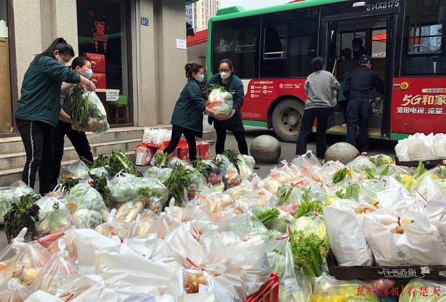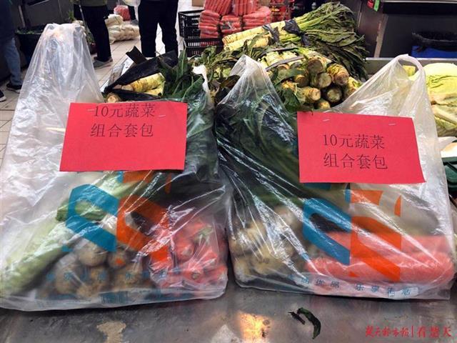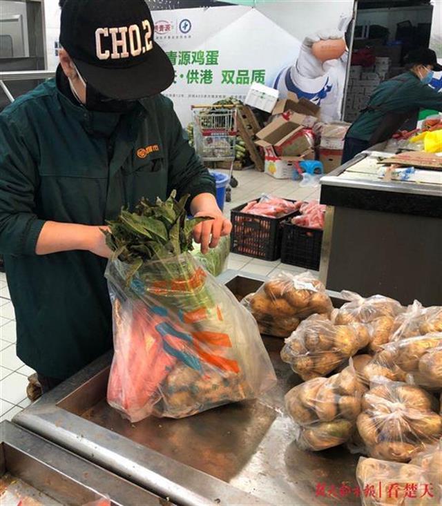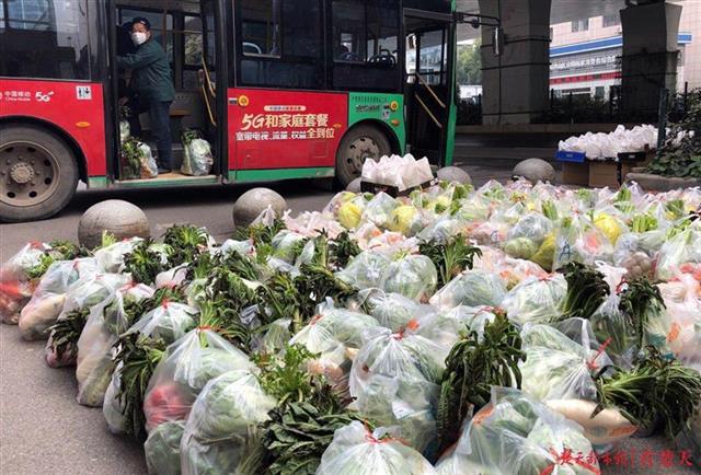 疫情期间,为让市民吃上放心菜、平价菜,武汉市政府推出10元菜包。24日,菜包所需蔬菜品种进入武汉各大超市,武商量贩卓豹店员工开始整理、打包。至25日上午10时许,该店接到400多份10元菜包网购订单。中午,员工们兵分多路,利用公交摆渡车将菜包运到相关社区。