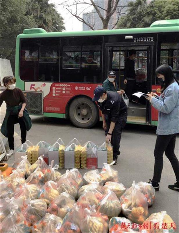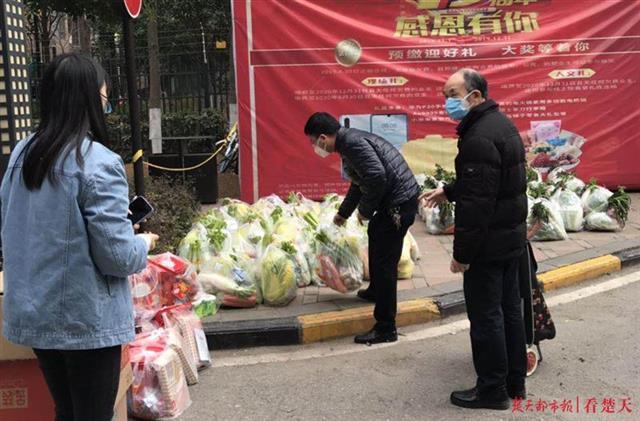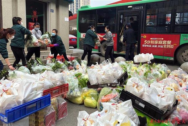 2月25日下午,一辆公交摆渡车停到武汉市洪山区五环小区门口。武商量贩卓豹店几名员工下车,把60多袋10元菜包搬到小区门口的取货点,居民们隔着一段距离排队领取。这是武汉三镇居民领取政府补贴10元菜包的一个场景。