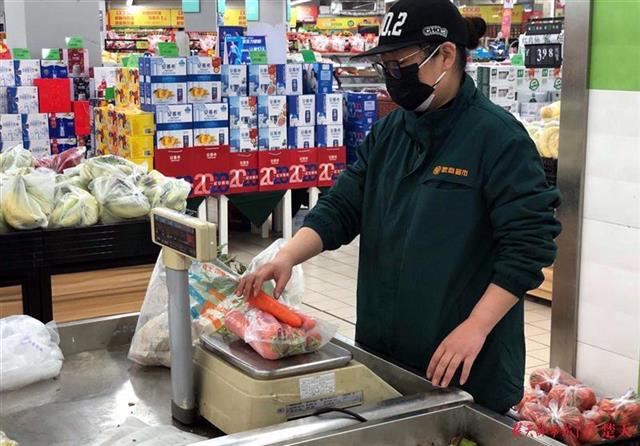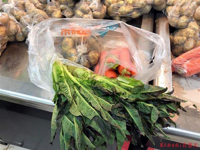 记者看到,10元菜包中,有土豆、胡萝卜、白萝卜、包菜、大白菜、莴苣等品种。市民根据需要在网上下单购买,超市打包后,和居民订购的其它生活用品,一起送到小区门口,方便市民就近领取。