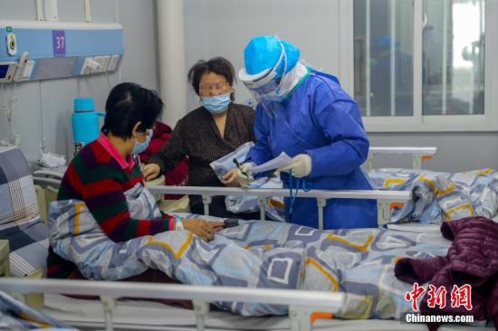 武汉火神山医院感染二科一病区的隔离病房内护士长胡晶为患者进行身体检查。中新社记者 张畅 摄