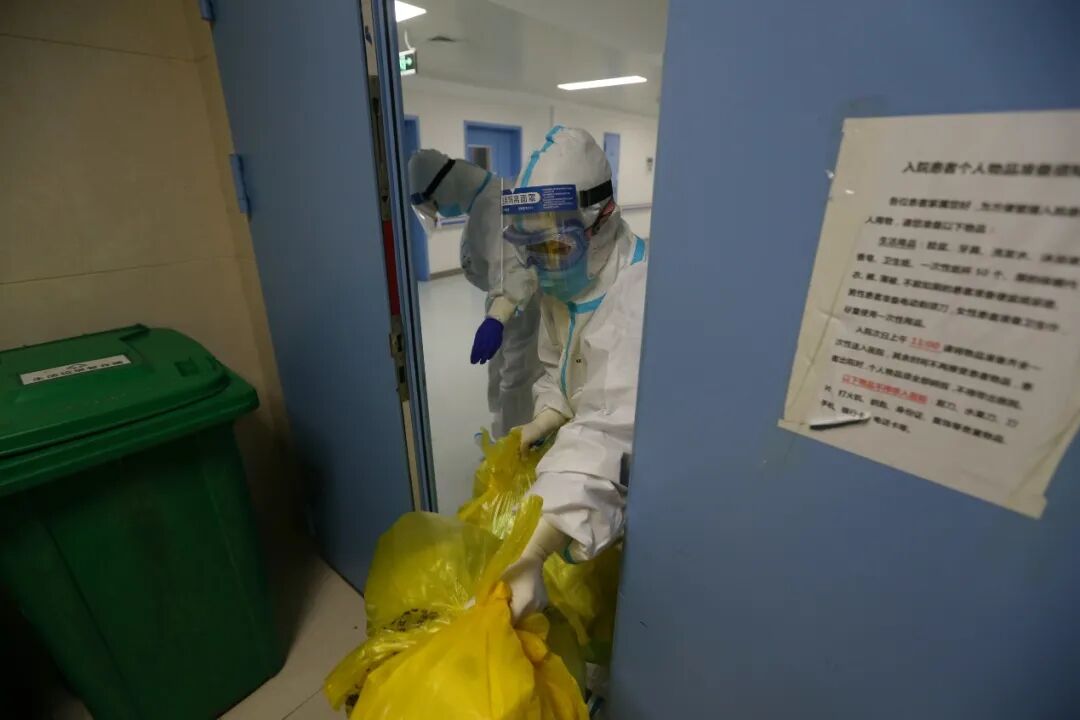 清晨,一名护士将夜里产生的医疗废物送出重症隔离区。(摄影:崔萌)