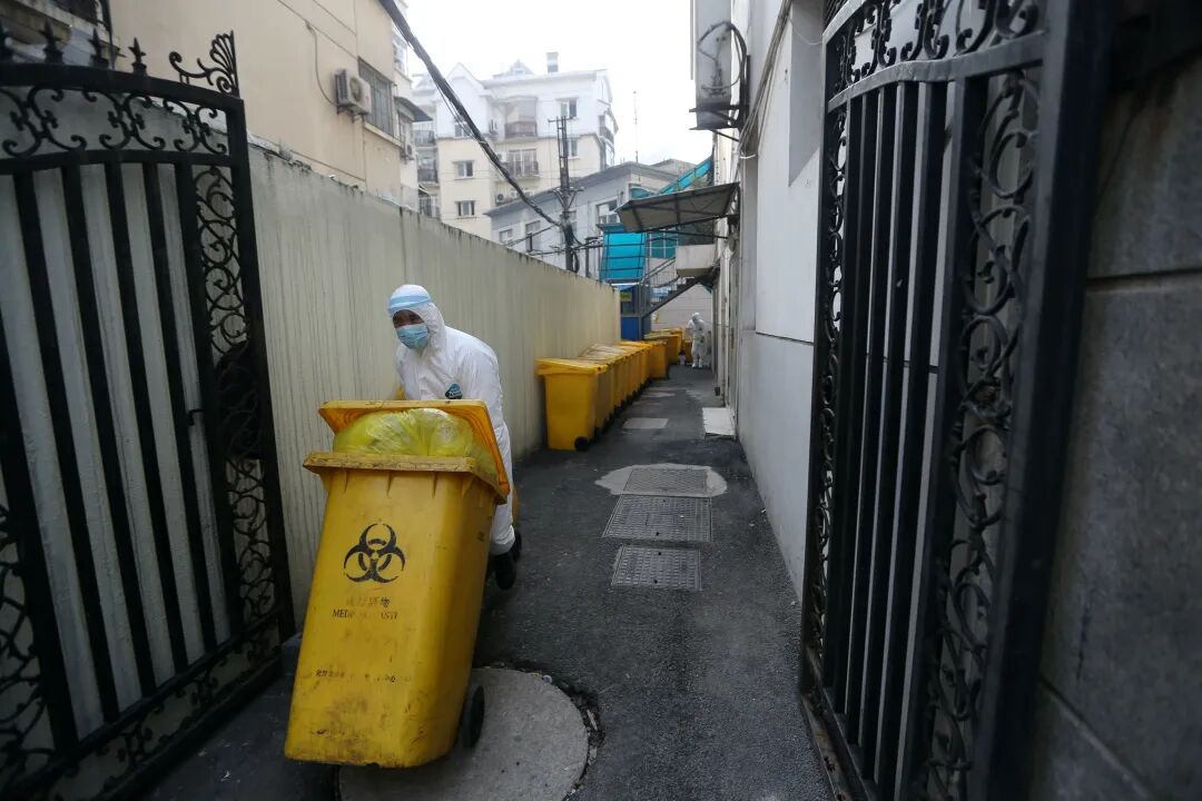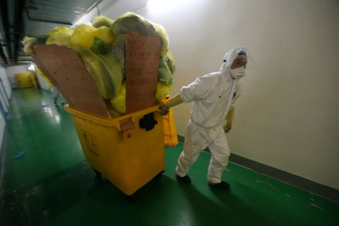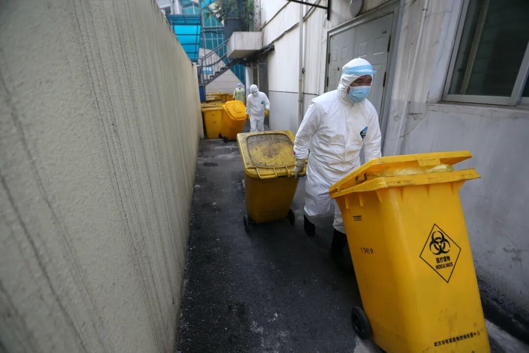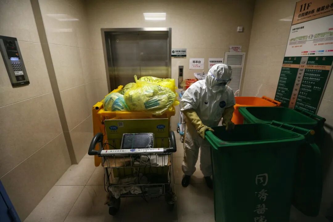 早上六点,武汉同济医院中法新城院区的工作人员开始上岗,清理住院楼内的医疗废物。(摄影:崔萌)