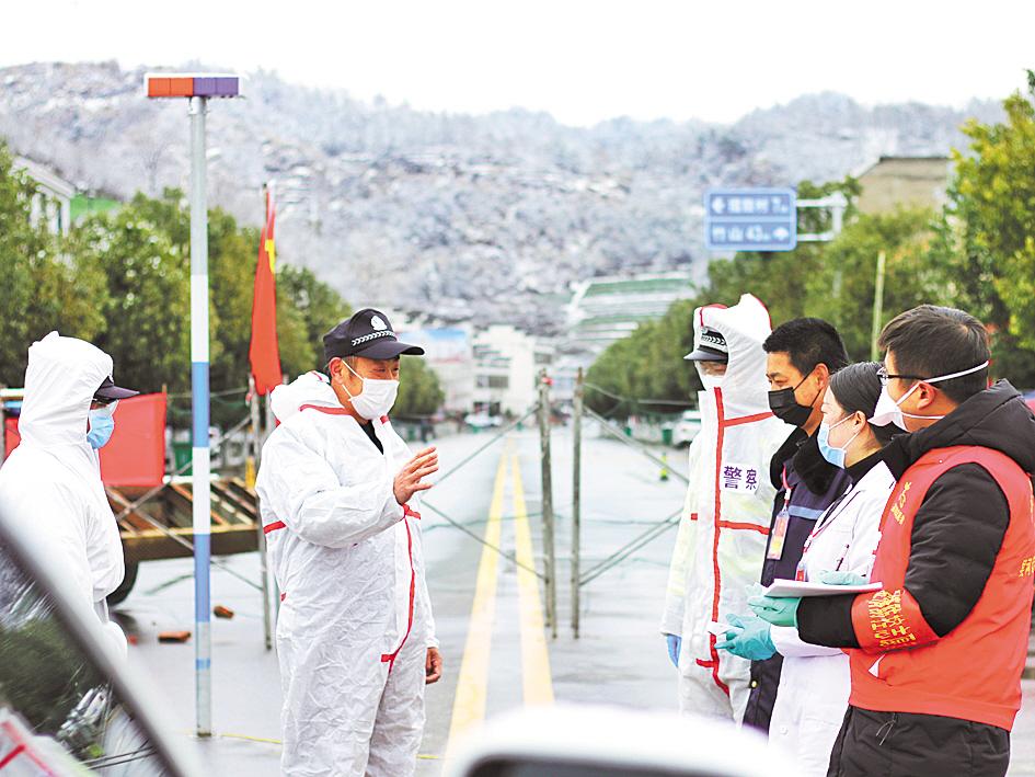 为保证防疫卡口文明规范执勤,竹溪县公安局民警分别深入各镇、村执勤点,向执勤人员讲授执勤纪律规范,要求做到情、理、法相结合,力所能及地为群众解决实际困难。图为2月22日,县河派出所民警在辖区执勤点开展工作。
