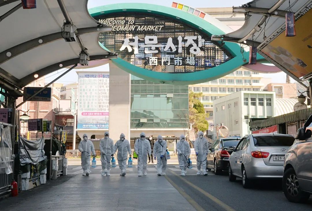 ▲2月23日,在韩国大邱,受疫情影响而临时休业的商家工作人员在西门市场进行防疫消毒。(新华社/纽西斯通讯社)