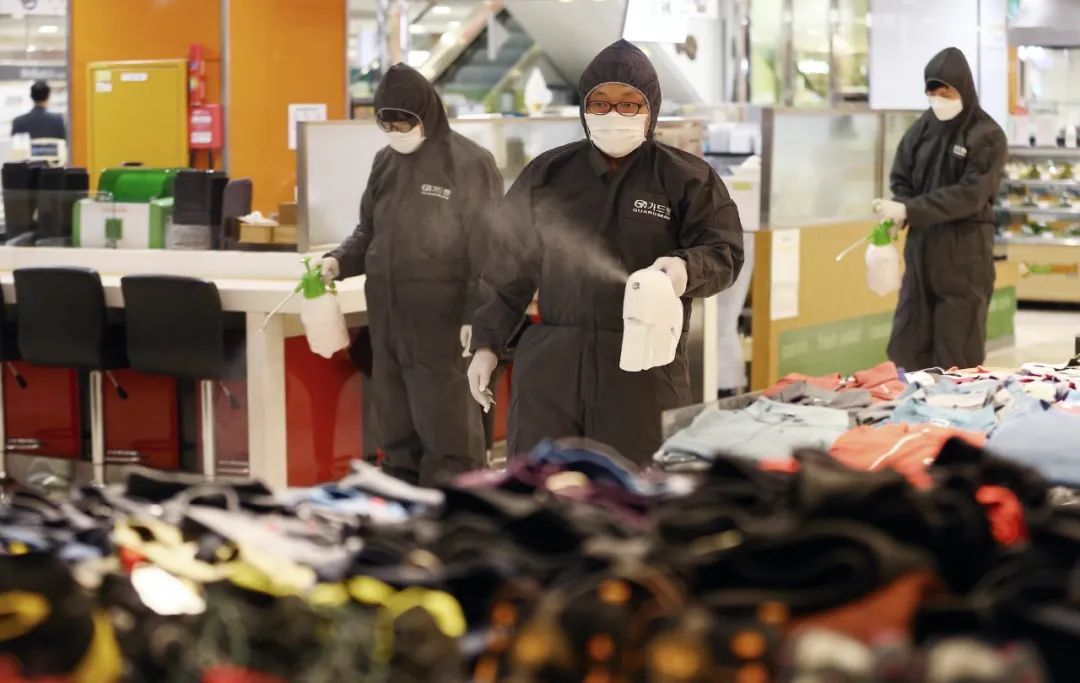 ▲2月24日,在韩国大邱,工作人员为一处商场消毒。(新华社/美联)