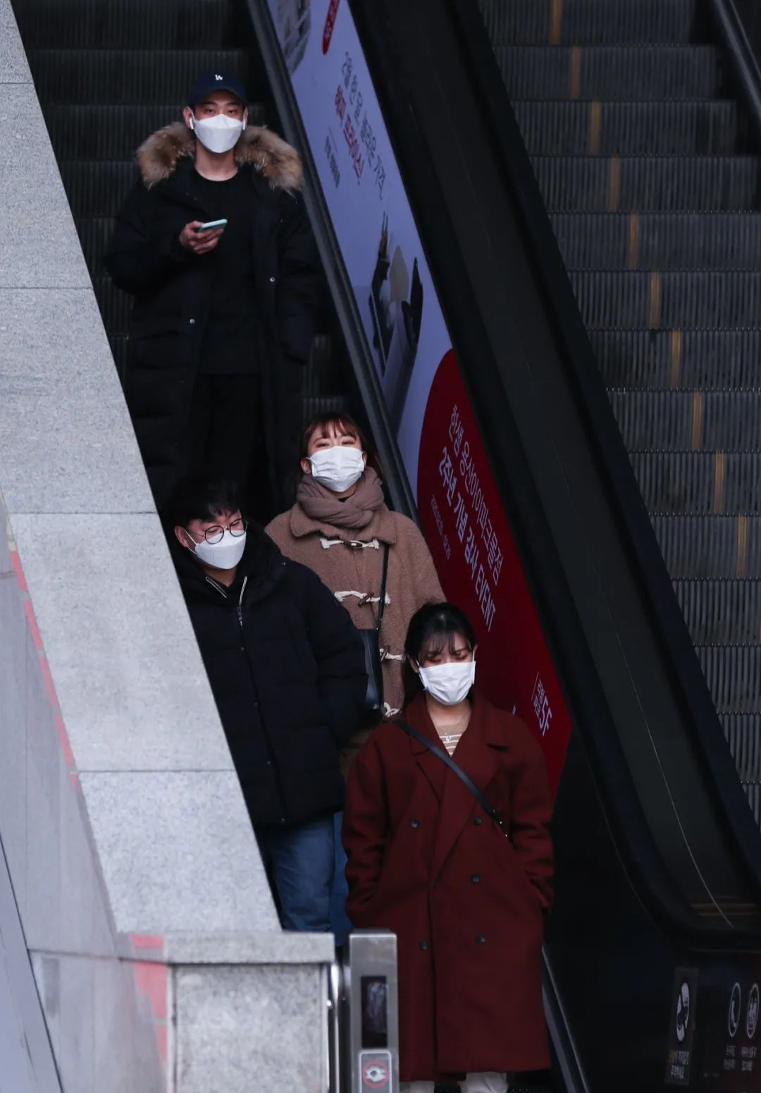 ▲2月24日,在韩国首尔,当地居民乘坐自动扶梯。(新华社记者 王婧嫱 摄)