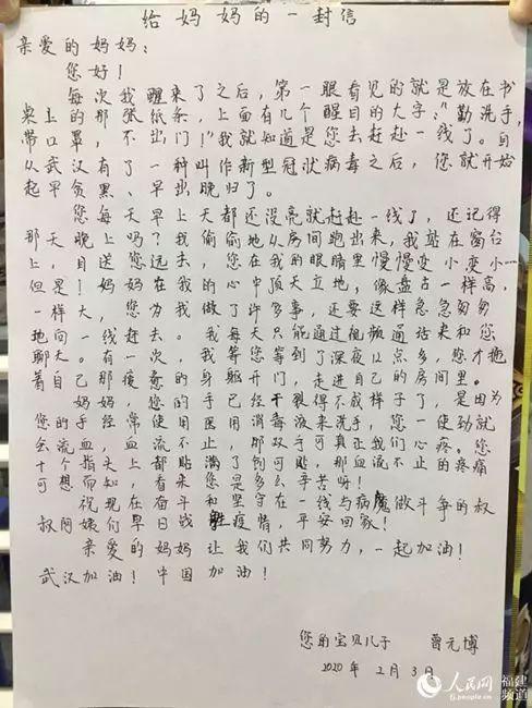 “祝现在奋斗和坚守在一线的叔叔阿姨们早日战胜疫情,平安回家。”信中,曾元博还不忘给妈妈鼓劲,“亲爱的妈妈,让我们共同努力,一起加油!”