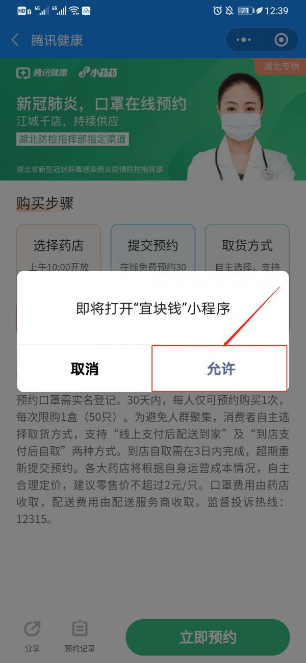 第二步:进入“预约口罩”板块后,点击下方“立即预约”后,允许进入小程序。
