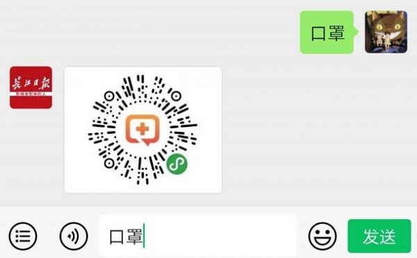 第一步:关注“长江日报”后发送关键词【口罩】,识别“腾讯健康”小程序二维码。