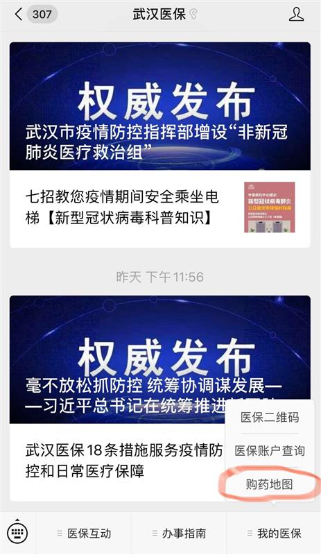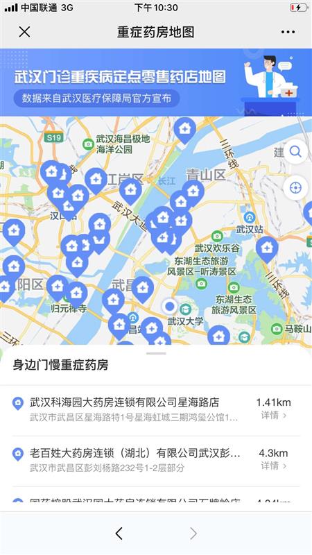 为方便不熟悉路的社区志愿者或患者快速找到身边最近的慢病重症定点药店,26日,武汉市慢病重症患者购药电子地图正式上线。市民关注“武汉医保”微信公众号后,进入“购药地图”,即可查找武汉市50家慢病重症定点药店相关信息。