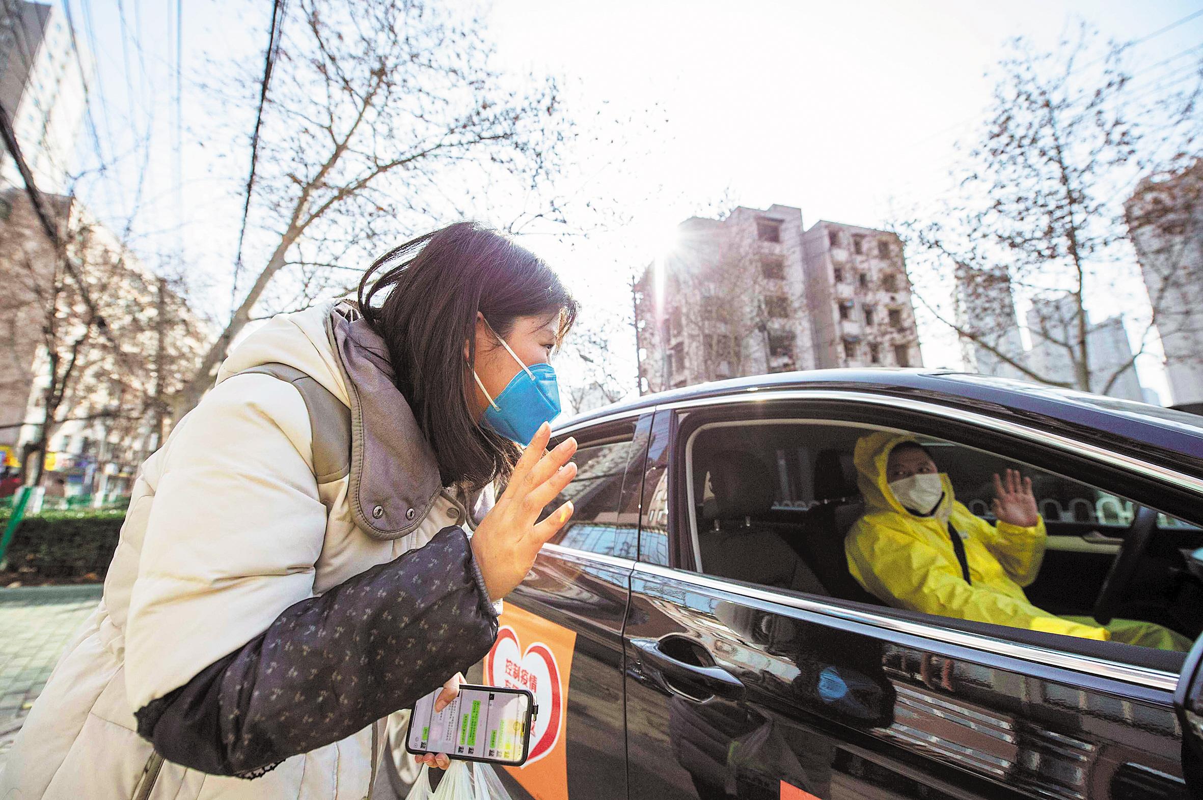 退役军人邹家伟,每天驾驶社区保障车为市民提供志愿服务。图为邹家伟送武汉市洪山区石牌社区一位居民外出买药归来,居民下车后挥手致谢。(湖北日报全媒记者 魏铼 摄)