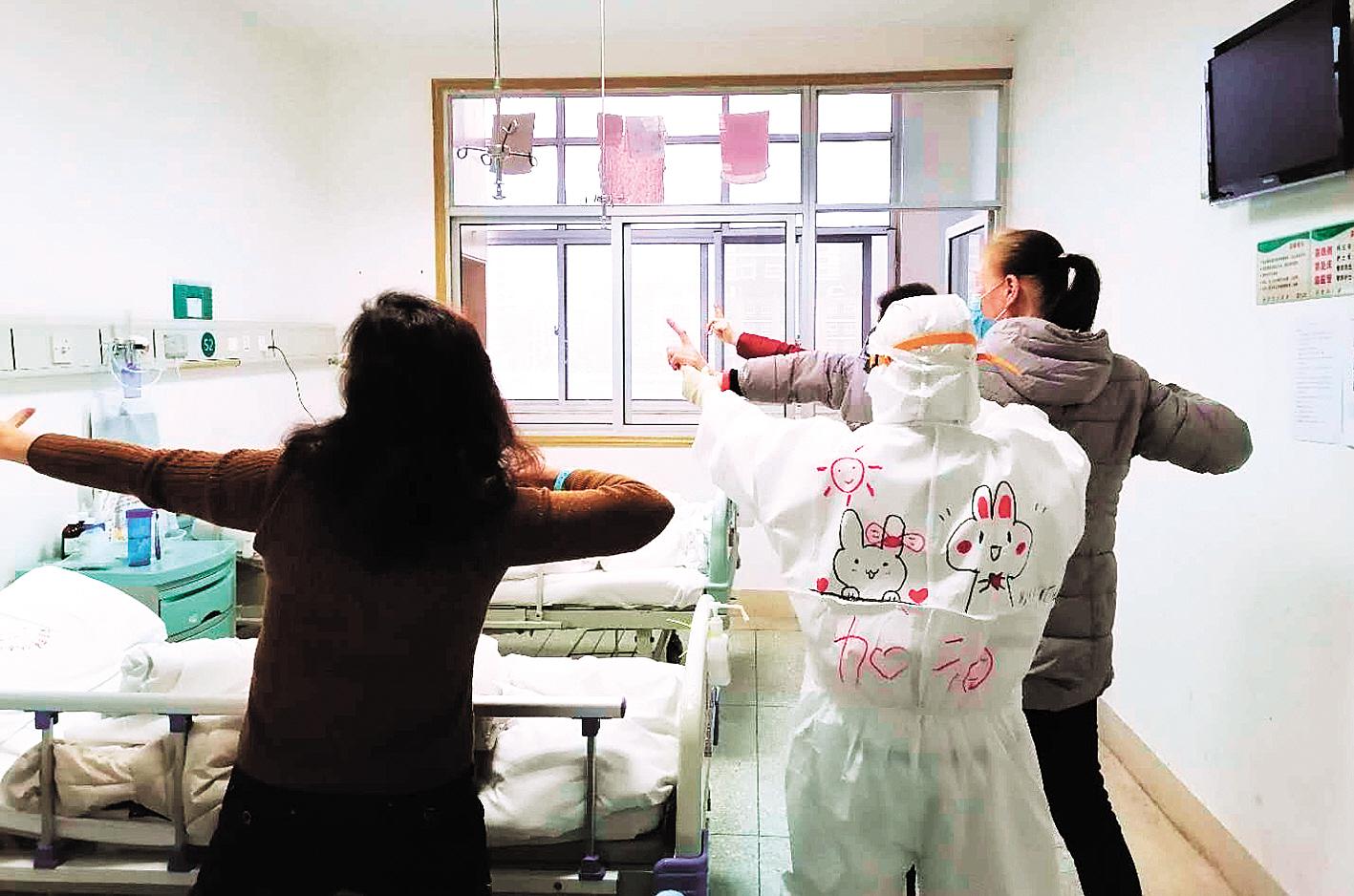 2月26日,宜昌市中心人民医院江南院区B楼5病区护士张萍萍(左二)正在教新冠肺炎患者做康复运动。张萍萍是患者的康复运动负责人,每天下午3点她就会在康复群里招呼大家一起来运动,并到每个病房现场指导,纠正大家的动作。通过运动帮助患者加强心肺功能,调节心情,增强信心。(视界网 舒德喜 摄)