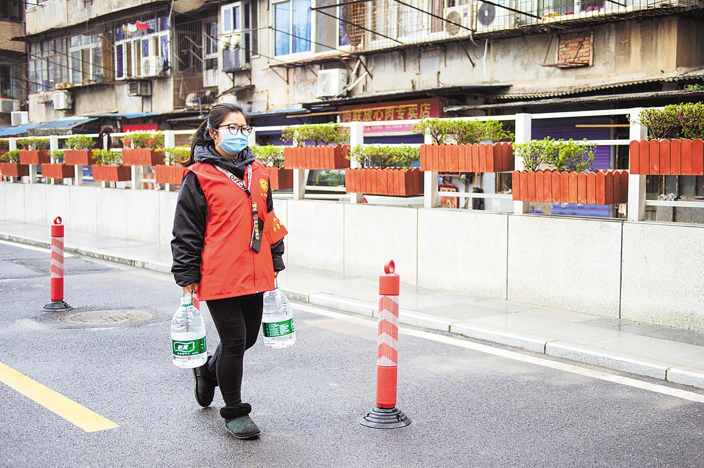 2月27日,张玉菡为外国邻居送纯净水。 (湖北日报全媒记者 蔡俊 摄)