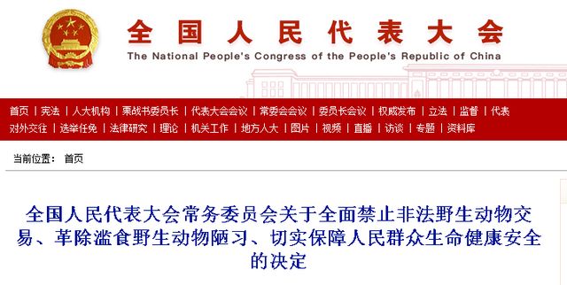 十三届全国人大常委会第十六次会议日前表决通过《全国人民代表大会常务委员会关于全面禁止非法野生动物交易、革除滥食野生动物陋习、切实保障人民群众生命健康安全的决定》(以下简称《决定》)。据介绍,修改野生动物保护法和动物防疫法也已经列入十三届全国人大常委会2020年度立法工作计划,同时将积极推进生物安全法草案审议和修改完善工作。