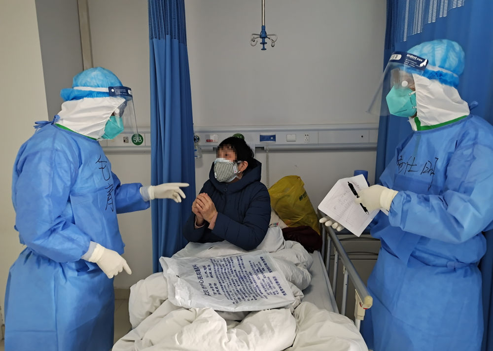 解放军感染病防控专家毛青(左)进入金银潭医院红区病房查房(1月31日摄)。新华社发(高涛 摄)
