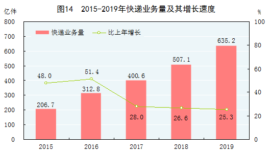 基础设施建设成绩斐然。交通运输设施不断完善。2019年末,高速铁路营业总里程超过3.5万公里,占全球高铁里程2/3以上;高速公路里程超过14万公里,稳居世界第一。邮政快递服务能力提升。2019年邮政行业业务总量达到16230亿元,比上年增长31.5%;快递业务量635.2亿件,增长25.3%。信息通信发展步伐加快。2019年移动互联网用户接入流量比上年增长71.6%。5G商用稳步推进,大数据、云计算、人工智能等现代信息技术快速发展,“网络强国”建设迈出坚实步伐。