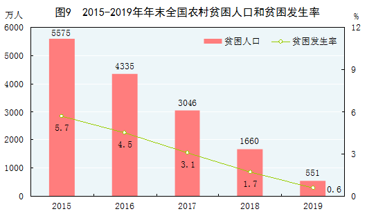 脱贫攻坚成效突出。贫困人口减少。2019年,1109万农村贫困人口脱贫,连续7年减贫1000万人以上;贫困发生率为0.6%,比上年下降1.1个百分点,向着消除绝对贫困迈出一大步。贫困地区居民收入较快增长。2019年贫困地区农村居民人均可支配收入11567元,比上年增长11.5%;扣除价格因素实际增长8.0%,快于全国农村居民人均可支配收入实际增速1.8个百分点。