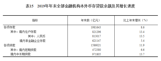 全年社会融资规模增量25.6万亿元,按可比口径计算,比上年多3.1万亿元;年末社会融资规模存量251.3万亿元,按可比口径计算,比上年末增长10.7%,其中对实体经济发放的人民币贷款余额151.6万亿元,增长12.5%。年末全部金融机构本外币各项存款余额198.2万亿元,比年初增加15.7万亿元,其中人民币各项存款余额192.9万亿元,增加15.4万亿元。全部金融机构本外币各项贷款余额158.6万亿元,增加16.8万亿元,其中人民币各项贷款余额153.1万亿元,增加16.8万亿元。
