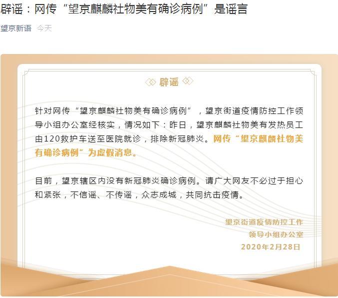 中新网2月28日电 据北京市朝阳区人民政府望京街道办事处官方微信消息,针对网传“望京麒麟社物美有确诊病例”,望京街道疫情防控工作领导小组办公室经核实,27日,望京麒麟社物美有发热员工由120救护车送至医院就诊,排除新冠肺炎。网传“望京麒麟社物美有确诊病例”为虚假消息。