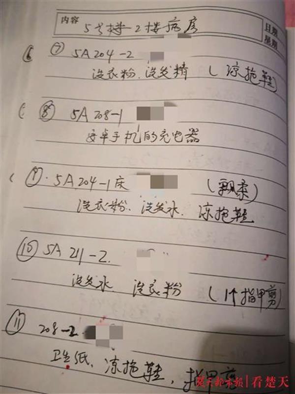 接下来几天,汤三立接班后的“重要任务”,就是跟着护士一起查房,看哪个患者有需求,要什么生活物资,一一记在心里,出舱后又记在工作日记本上,一一代购。找他带东西的患者越来越多,勺子、山楂片、饼干、洗发水、拖鞋……每天进舱执勤,他都像出远门一样拎着大包小包,几天下来已经给20余名患者提供了帮助。患者们十分感激,纷纷提出要给钱,汤三立说:“都是些小东西,等你们康复出院后再一起给!”患者们笑了:“汤警官你每次都穿着防护服,我们都不知道你长什么样子……”汤三立说道:“记得我背上的四个字就行了,武汉公安!”