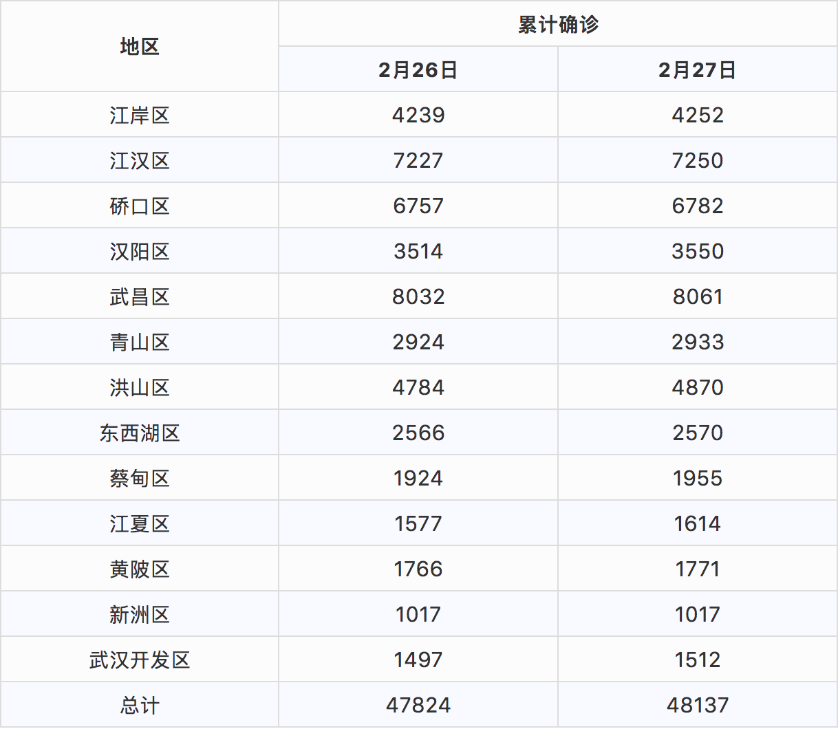 截至2月27日24时,全市累计报告确诊病例48137例,其中(大疫情网按行政区统计):