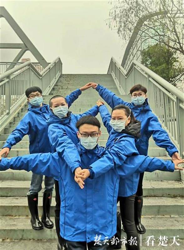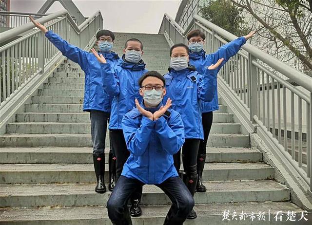 “一个月了,我们来和武汉合个影。来,我们摆几个好玩的样子,让家人看看,我们在武汉好好的。”2月28日,正好是浙江省宁波市援助武汉抗疫医疗队二队一行5人,驰援武汉一个月的时间。他们均来自宁波市象山县中医医院,在武汉同济医院光谷院区抗疫一线救治病人。