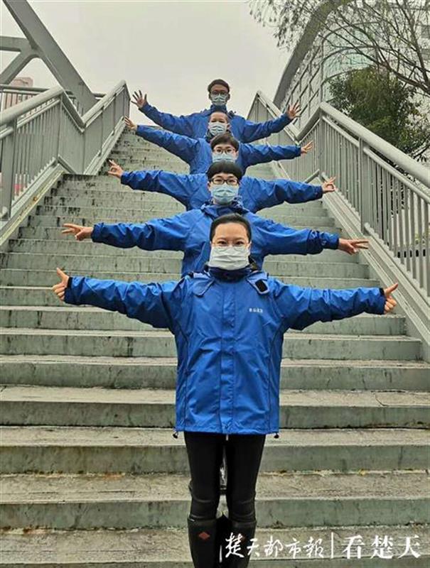 因为武汉正是抗击新冠肺炎的严峻时期,交通限制,他们去不了长江大桥、登不了黄鹤楼、游不了东湖。于是选择今日,在武昌街道口——他们住的酒店旁边的人行天桥上拍照。虽没有武汉的名片做背景,但他们觉得不重要,重要的是他们能在武汉参与抗疫。这次拍照,将是他们一生中美好的回忆。