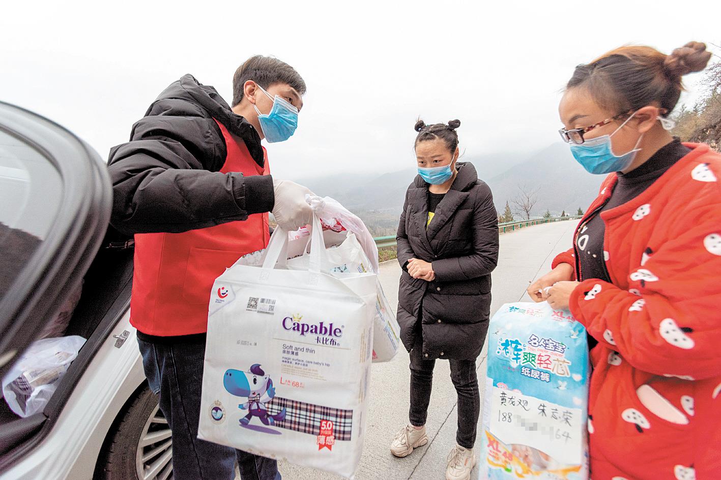 2月26日,志愿者王明海将奶粉送到保康县马桥镇黄龙观村民手中。在疫情防控特殊时期,婴幼儿奶粉、纸尿裤是众多母婴家庭的必需品。保康县通过志愿者代购、电商配送、超市送货等方式,保障居家群众的基本生活需求。