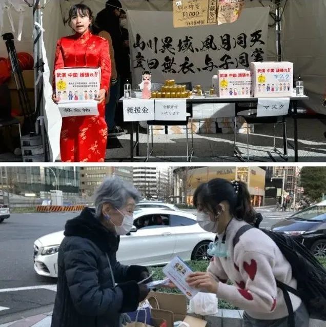 上图是2月8日,在日本东京池袋,日本旗袍女孩为武汉募捐(新华社发);下图是2月20日,在日本名古屋车站附近,在日华人华侨向行人发放口罩(活动举办方供图)。