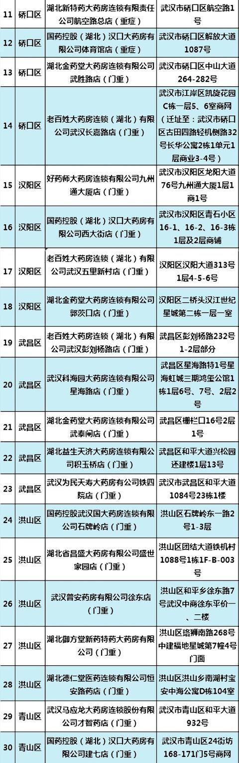 湖北省肿瘤医院、同济医院(本部)、协和医院(本部)、武汉大学人民医院(本部)、中部战区总医院及汉口院区、武汉市中心医院南京路院区、武汉市中医医院胜利街院区、武汉市普仁医院、武汉市第六医院